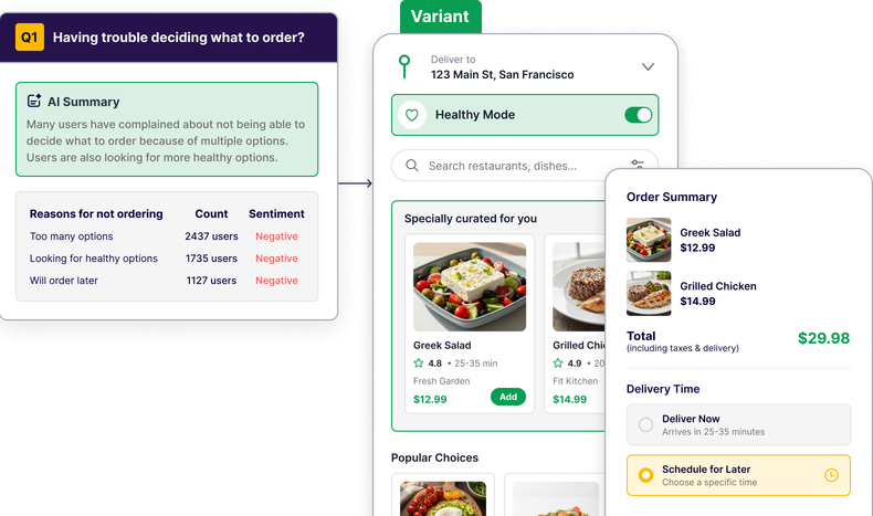 Get instant session summaries (individual & cohort-level) to capture user intent, behavioral patterns, and friction points easily. along with actionable recommendations to fix what’s broken. Save the crucial insights as test hypotheses and move from observation to optimization, in minutes!
