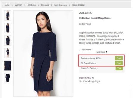 Según uno de sus estudios, del que hablaremos más adelante, Zalora se propuso el objetivo de incrementar el número de checkouts mediante la optimización de su página de productos. Para ello, optaron por destacar algunas de sus funciones, como las devoluciones y los envíos gratuitos. Realizaron cambios en todas las páginas de productos de su sitio web, tanto en inglés como en chino.
