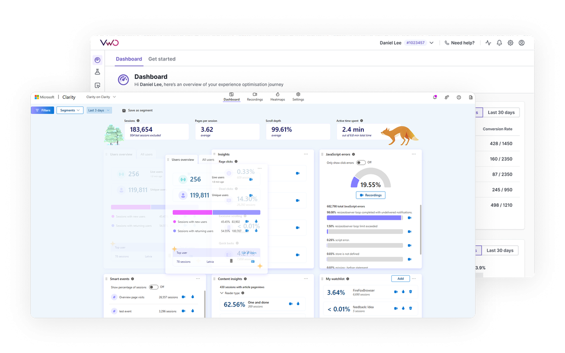 Integrating VWO with Clarity allows you to push VWO campaign data into Microsoft Clarity, where it can be used to view the session recording, heatmaps of the users based on the experiment or personalization campaign they were part of.