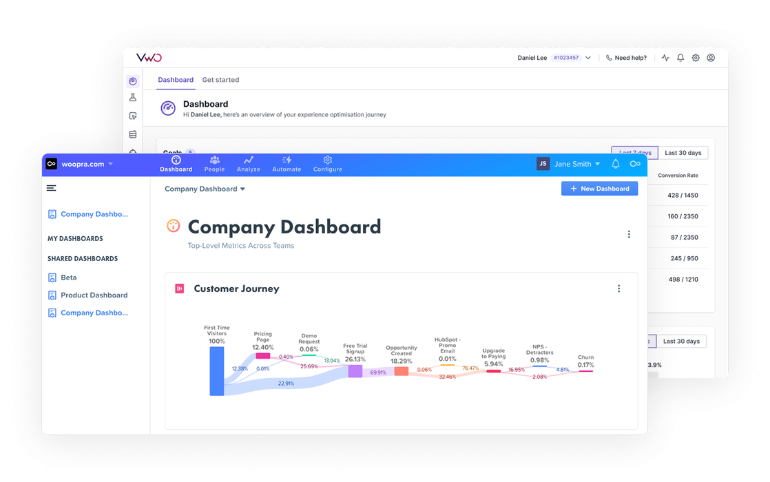 The integration allows you to combine VWO’s A/B testing data with Woopra’s customer journey tracking. This means you can understand how different variations of your website elements influence the entire customer journey, not just immediate conversion rates.